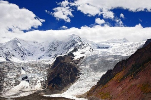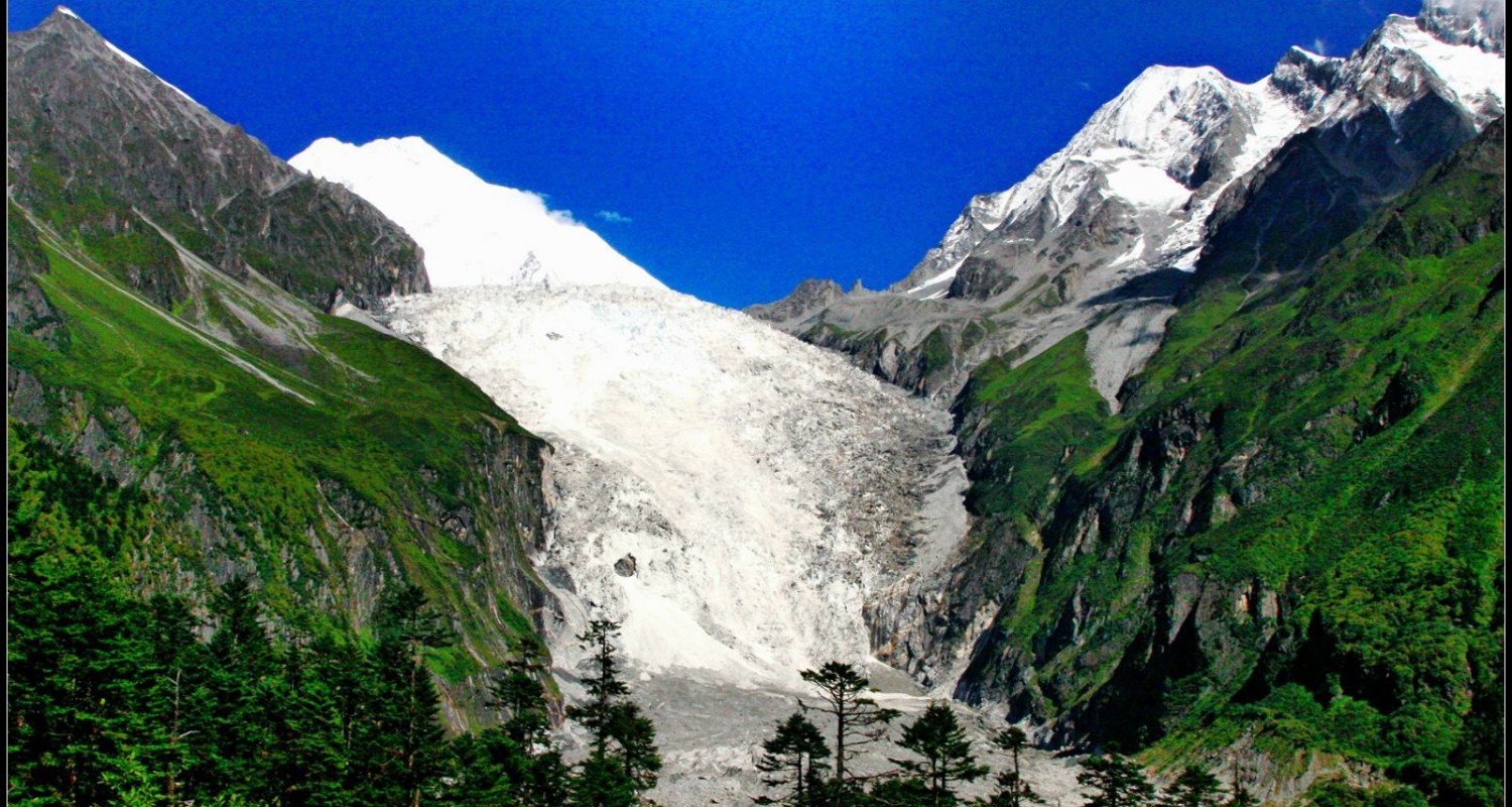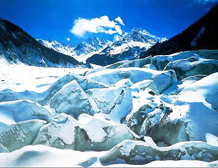 沿冰川上行三公里,绕过黑松林,即可望见这条大冰瀑布。冰瀑布宽达1100米,落差1080米,由无数 极其巨大的光芒四射的冰块组成,仿佛从蓝天直泄而下的一道银河。除非你亲眼见到,没有任何词汇能形容它的瑰丽笥伟大。冰川最高点的海拨为6750米,而最 下端的海拨高度仅为2850米,它不但是低纬度低海拨的冰川,而且是落差最大的冰川。