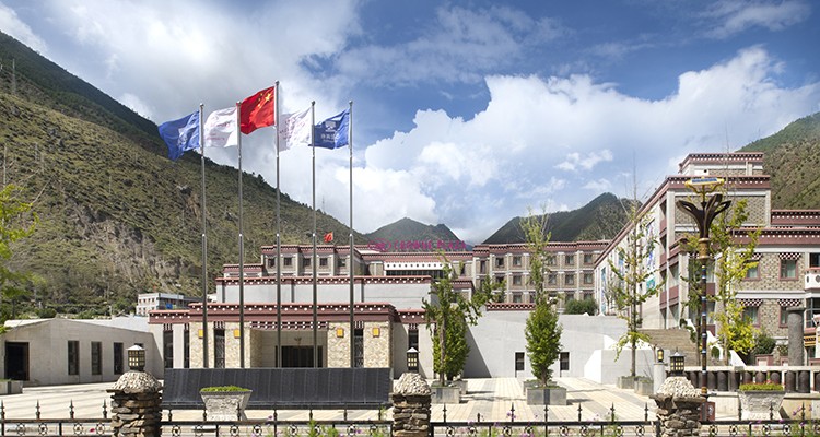 酒店一期建筑面积 20000多平方米,依山傍水,风景秀丽。 酒店现拥有两百余间客房,巧妙地融入藏式建筑特色。客房设计以独特的装饰品味和舒适为理念,在神山圣境中寻觅现代居住感觉,让客人既享受美景又体会家的舒适。酒店依山而建,整间酒店采用退坡式的梯形建筑形式,使80%的客房都能观赏到室外风光。
