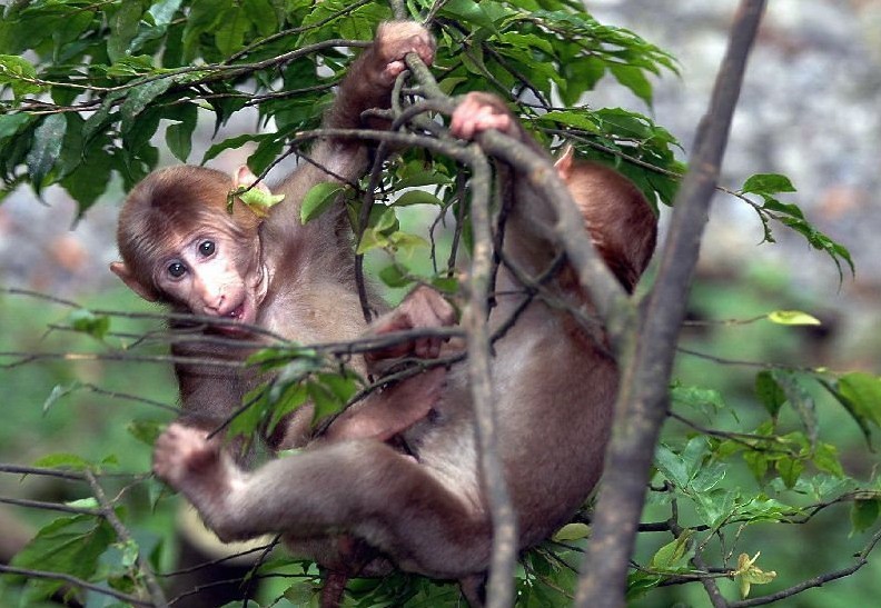 同人类一样,峨眉山猴也实行“朝九晚五”上班制。每天早上9点左右,猴区就像集市般热闹。随着管理员打锣、吹哨声,猴儿们便在猴王的率领下,扶老携幼、拖儿带女地来到猴区游山道和栈道旁“上班”,与人同乐,直到下午5点以后在管理员的催促和吆赶下才告别游人“下班”。