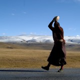 “磕长头”是藏传佛教信仰者最至诚的礼佛方式之一,为等身长头,五体投地匍匐,双手前直伸。每伏身一次,以手划地为号,起身后前行到记号处再匍匐,如此周而复始。这些动作并非随意编排,每个动作都有着非凡的意义。