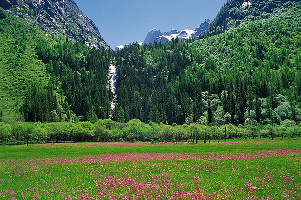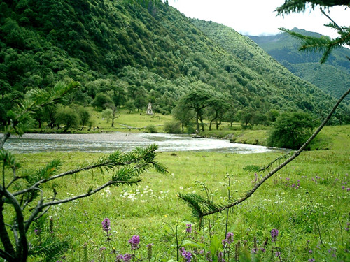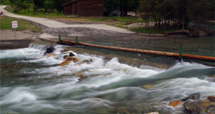 撵鱼坝距盆景滩4公里,海拔3500米左右,属半沼泽地。沼泽地中蜿蜒曲折的栈道深入茂密的沙棘林中,山涧雪水沿大沟冰川悬谷飞流而下,汇入湍急的双桥河,河中生长着大渡河流域特有的鱼类;大渡裸裂尻鱼。