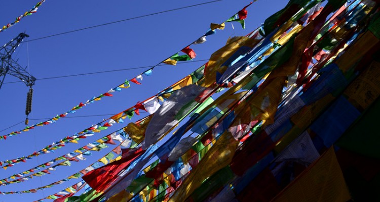 嘉措拉山山口,也称定日界,这里也是珠峰国家级自然保护区的山口,巨大的保护区标牌竖立在公路上,无数的经幡迎风飘扬。嘉措拉山口5220米,水泥标高牌上挂满了五彩经幡。海拔4000米以上植被稀少,天空细腻柔软,山地粗砺坚硬。视野的上半部是纯净的瓦蓝色,下半部是单调的赭红和灰黄。除了灰色的山路,几乎没有生命痕迹。藏民在人迹常至之处扯起经幡,经幡多用红蓝黄绿,以其强烈大胆同那天地的单调达成了平衡。