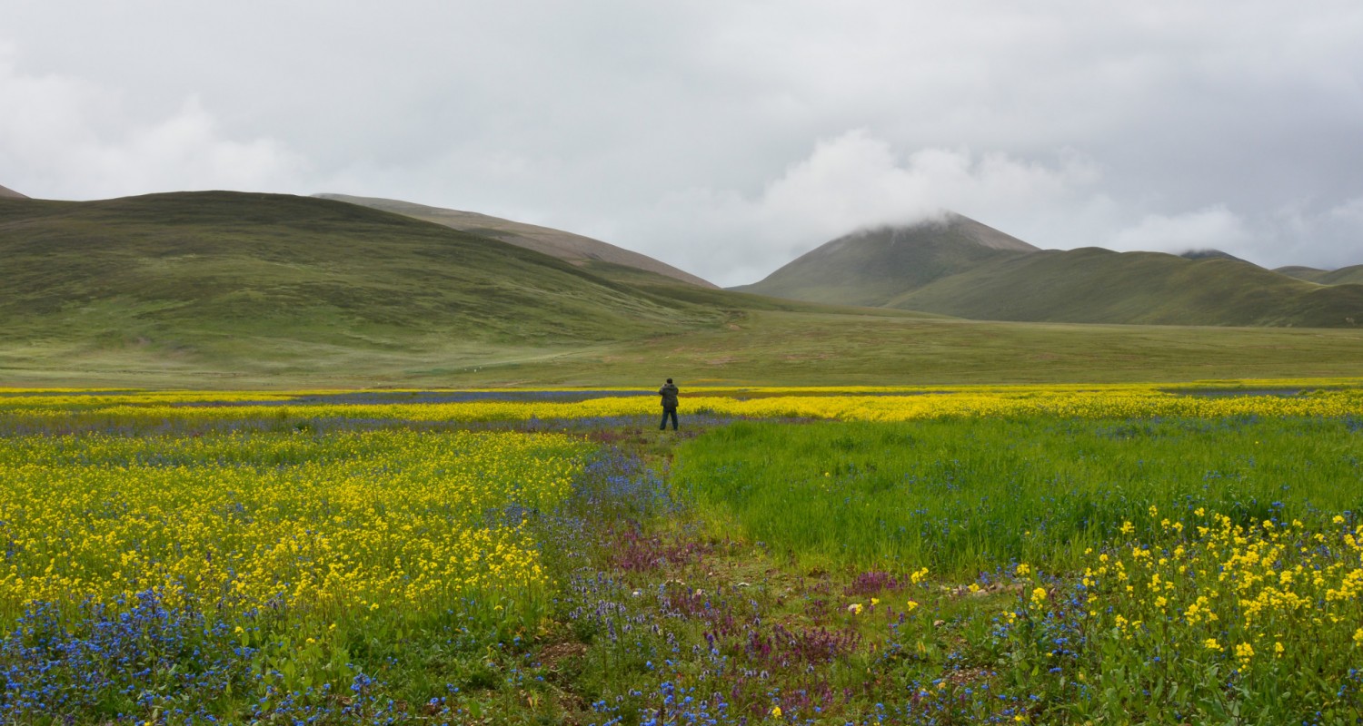 由于草甸草原根系十分发达,众多的根系纠结使之逐渐形成了像地毯般的草毡层,踩上去既松软又富弹性。每当盛夏,草原上开满五颜六色的小花,素有"五色草甸"之称。生活在这里的牦牛和绵羊的个体都高于西藏腹心地区。