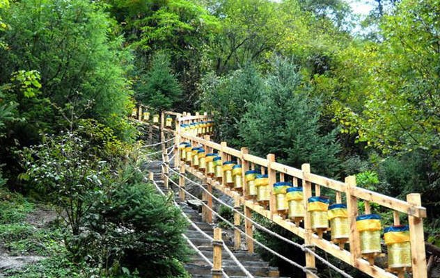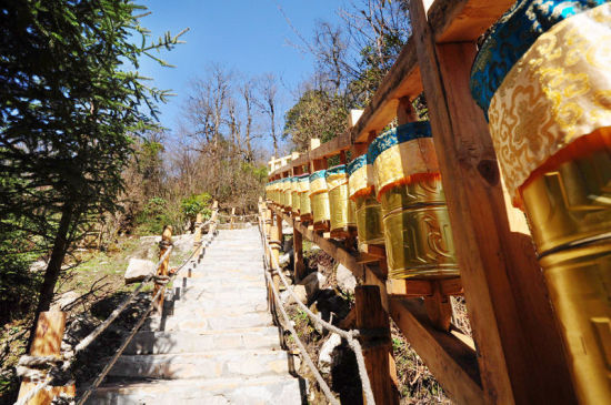 登天梯右手边有排转经筒,如果你去过藏区,就会发现转经筒在这片土地上遍地开花,各大寺庙的周围都有。转经筒是通过转动经文为各种有形无形的生命弘扬佛法,转经筒内藏有六字大明咒“唵om嘛ma呢ni呗bei咪mei吽hong”经文。每转动一次转经筒,就相当于将“六字大明咒”诵扬出去一次,为世界众生祈福。在攀登天梯之时顺时针转动转经筒,经筒每转动一圈,就代表着一次祈福,可以保佑身体健康、事业顺心。 在藏传佛教中,持诵六字大明咒能清净一切十不善业、五无间罪等等以身语意所造的业障和习气。