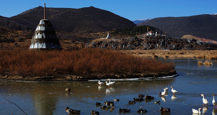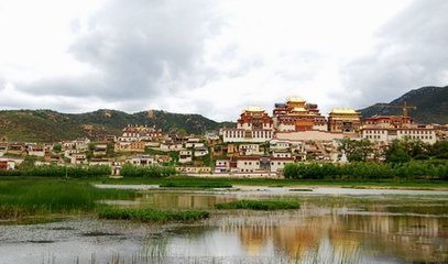 拉姆央措湖面不大,但在藏区名声很大,景色秀美异常,湖中四季有各种水鸟生息,黑颈鹤、黄鸭等水鸟随处可见。站在扎仓大殿顶上观望拉姆央措湖,它是一个佛自然的投影。