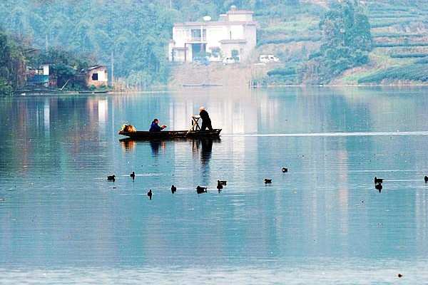 水碧如蓝,宛若平镜。湖水源于夹金山下的玉溪河,碧水长流,进出不断,水质优异,清澈可鉴。良好的生态环境使百丈湖成了水禽乐园。冬春有万千野鸭嬉水,夏秋有成群白鹤翔空,宛若云团覆落。湖周浅山环列,林木葱茏,倒影湖中,无限诗情画意。沿百丈湖周新建的一些度假村等建筑组群,因各有风格特色,已成为湖区新景点。