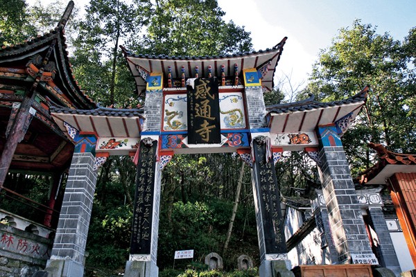 寺庵左右凸现出两道恰似扶手的山梁,向上延伸的圣应峰恰如椅背;高山植物郁郁葱葱,青翠如毯。一寺一庵仿佛两位“禅师”打坐于硕大的交椅之中。升腾的香烟缭绕在寺庵顶端;缭绕在森林当中,着实有神秘莫测的佛教韵味。近年,从感通寺至清碧溪架设了全长2630米、全封闭、安全可靠的感通索道,成为苍山一道亮丽的景观。揽车犹如银梭在密林深处穿越。乘坐高册揽车,别有一番惬意和情趣。