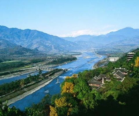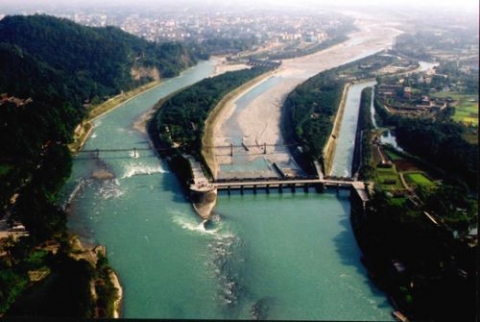 都江堰由鱼嘴、飞沙、宝瓶口三部分组成。鱼嘴是修建在江心的分水堤坝,把汹涌的岷江分隔成外江和内江,外江排洪,内江引水灌溉。飞沙堰起泄洪、排沙和调节水量的作用。宝瓶口控制进水流量,因口的形状如瓶颈故称宝瓶口。内江水经过宝瓶口流入川西平原灌溉农田。从玉垒山截断的山丘部称为"离堆"。都江堰是著名的古代水利工程,位于四川省成都平原西部的岷江上,今都江堰市城西。它处于岷江从山区泻入成都平原的地方。在都江堰建成以前,岷江江水常泛滥成灾。公元前256年,秦国蜀郡太守李冰和他的儿子,吸取前人的治水经验,率领当地人民兴建水利工程。都江堰建成后,成都平原沃野千里,成为天府之国这项工程直到今天还在发挥着作用,被称为活的水利博物馆。