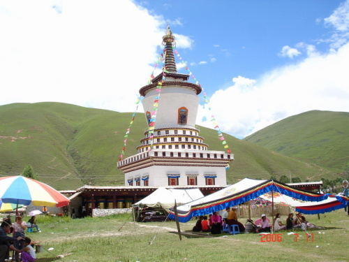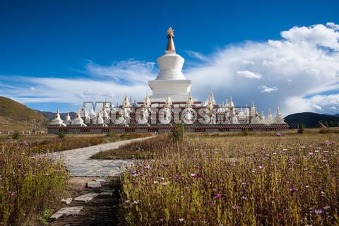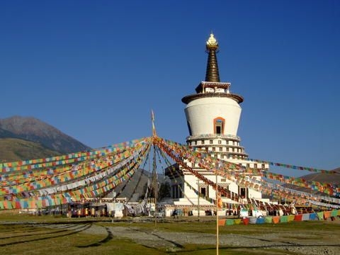尊胜白塔整体构造壮观雄伟,这座造型雄伟、气势磅礴的白塔,就是藏区最高的佛塔郎吉曲登。郎吉曲登意为金刚宝座佛塔,汉语称之为“尊胜白塔”。尊胜白塔与尼措山麓的灵雀古刹遥遥相对,为鲜水古镇增添了浓郁的宗教色彩。1986年7月,时任全国人大副委员长的十世班禅大师视察道孚时,谕示教徒:“为维护祖国统一、民族团结和藏区的稳定,不分民族,不分地区,不分教派,共建佛塔,以示祝愿”。并亲笔为白塔题名:“郎吉曲登”。1988年奠基兴工,历时数载,耗资百万,1991年落成开光,对外开放。全国人大副委员长阿沛·阿汪晋美亲笔题写“发扬班禅爱国主义精神”的题辞,以兹纪念。