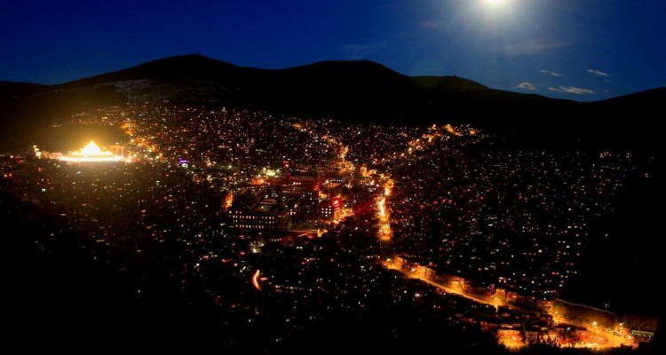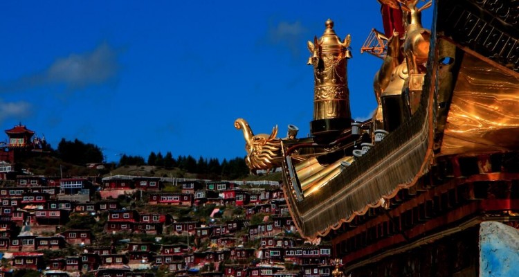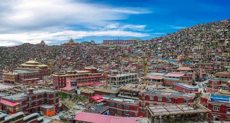 色达喇荣寺五明佛学院,坐落在四川省甘孜藏族自治州色达县境内向东南方向约20公里处,海拔4000米上。在重重的群山环绕之中,沟里的僧舍,以佛学院的大经堂为中心,密密麻麻搭满了四面的山坡,不计其数的绛红色小木屋,延绵无数,一眼望不到头。这些红色小木屋,是数千名僧侣和尼姑的住所