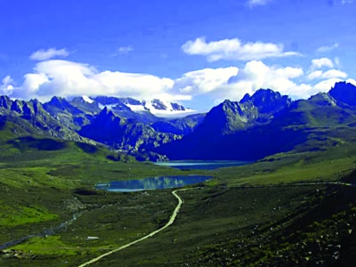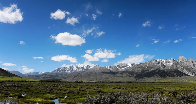 章德草原在雪山的环拥下,章德大草原像一副碧绿的画卷。牛羊在草地上悠然自得的漫步,牧民的帐篷升起袅袅炊烟,青藏高原独有的高海拔草垫和灿烂的鲜花,映衬着湛蓝的天空,草原上一望无际、姹紫嫣红,绿色的地毯上点缀着各色娇艳的花朵。 在章德草原的入口处,高原湿地群落里成对的黄鸭和高山野鸭同在清澈的水塘中嬉戏。在藏区千古传颂的“情侣鸟”,时而潜入深水之中,时而展翅于蓝天白云之下。草原的中央处,有一处温泉,温泉上空热气升腾,牧童们在温泉里撒落着稚嫩的脚丫。