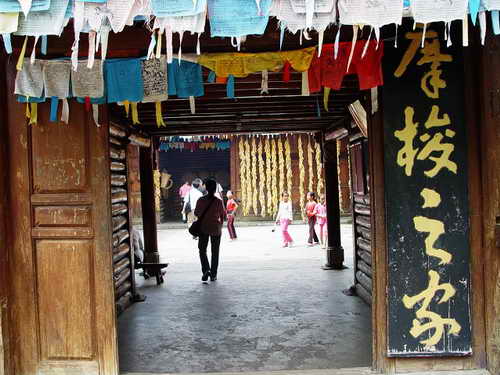 从纳西族村翻过一座葱茏的小山峦,紧依泸沽湖畔建有一座摩梭人居住的“木楞房”,这座全部用圆木建成风格拙朴的四合寨楼被取名为“摩梭之家”。